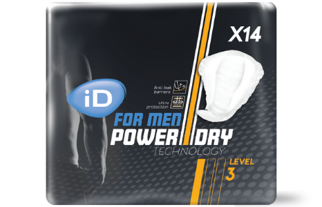 Uudistetussa iD For men tuotesarjassa käytetty POWER DRY -teknologia takaa nopean imeytymisen, suuren imukyvyn sekä pintakuivuuden antaen käyttäjilleen itseluottamusta ja vapautta elämään. Erityisesti miehille suunniteltu vartaloa myötäilevä ohut kourumainen muotoilu takaa tehokkaan, kevyen ja hiljaisen suojan tarjoten maksimaalista mukavuutta ja huomaamattomuutta käyttäjälleen. Joustoresorien ja reunavuotosuojien ansiosta suoja istuu napakasti ja teippiraita pitää suojan kiinnitettynä käyttäjän omiin alusvaatteisiin antaen lisävarmuutta ohivuotoja vastaan.