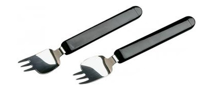 Haarukassa, lusikassa ja teelusikassa on erityinen joustava metallivarsi, jota voi taivuttaa haluttuun asentoon mihin suuntaan tahansa. Lusikka sopii niin oikea- kuin vasenkätisille. Kahvan materiaalina kumiseos, metalliosa ruostumatonta terästä. Voidaan pestä astianpesukoneessa. Kahvan väri musta.